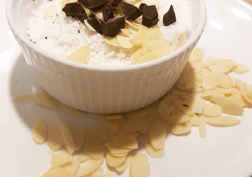 Żelatynę zalej 2,5 łyżkami gorącej wody, wymieszaj dokladnie tak, aby się rozpuściła i odstaw do wystygnięcia. Jogurt wymieszaj z białkiem, następnie z żelatyną, przelej do salaterki lub kokilki. Wstaw do lodówki na 4 godziny. Następnie całość posyp wiórkami, płatkami migdałów i pokruszoną czekoladą.