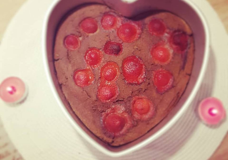 Ugotowane bataty zblenduj z daktylami, następnie stopniowo dodaj pozostałe składniki (oprócz czekolady), ponownie zblenduj na gładką masę, dodaj pokruszoną czekoladę. Ciasto przelej do formy (formę popryskaj sprayem beztł. lub delikatnie posmaruj olejem kokosowym). Na wierzchu ułóż truskawki.