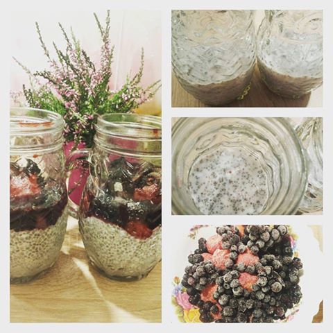 .Nasiona chia w kąpieli migdałowej w towarzystwie owoców leśnych.