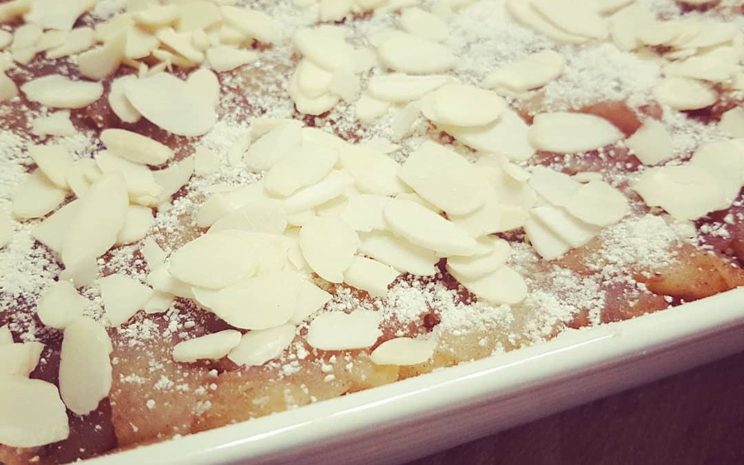 Formę na ciasto posmaruj olejem kokosowym lub popryskaj sprayem beztl., następnie wyłóż zblendowaną kaszę jaglaną, na wierzch dodaj jabłka i posyp płatkami migdałowymi.
