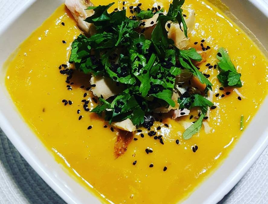 Cebulę i czosnek kroimy i podduszamy na patelni (używam sprayu beztł.), następnie wrzucam do garnka, dodaję obrane i pokrojone bataty, zalewam ciepłą wodą ( co skraca czas gotowania) do przykrycia warzyw i gotuję do miękkości. Następnie dodajemy mleczko kokosowe i przyprawy. Blendujemy. Jako dodatek u mnie zawsze natka pietruszki i czarnuszka.