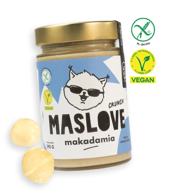 Takiego smaku jeszcze u nas nie było, ale jesteśmy pewni, że pokochasz go tak, jak my! Masło z orzechów makadamia to hit wśród past orzechowych i zupełna nowość w ofercie Maslove. Jest pełne smaku i niezwykłego aromatu, a przecież powstało w 100% z naturalnych składników, czyli pieczonych orzechów makadamia. Bez dodatku cukru, oleju palmowego, konserwantów i polepszaczy smaku. Jeśli szukasz alternatywy dla niezdrowych przekąsek, wypróbuj nasze pyszne masełko. Mamy nadzieję, że znajdzie stałe miejsce w Twojej kuchni!